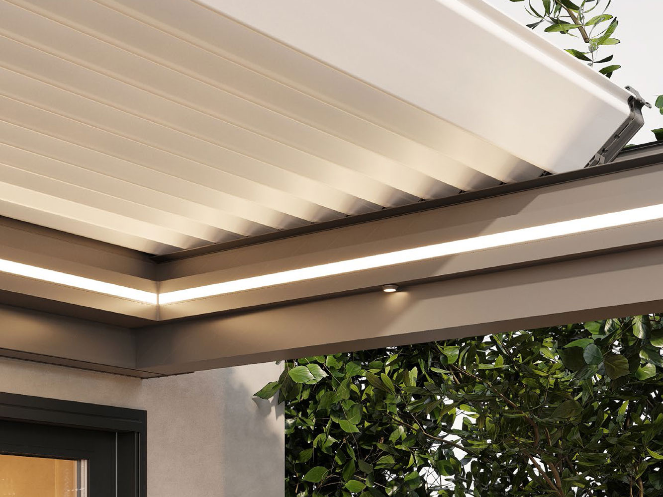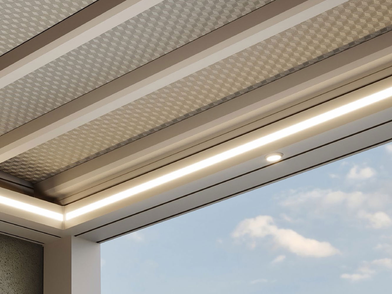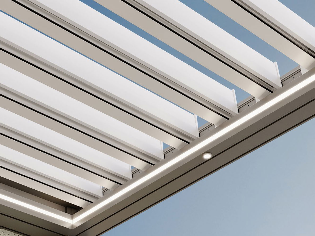 Ces toitures peuvent être équipées de systèmes LED blanc chaud, froid ou RGB, avec variateur d’intensité et contrôle à distance.