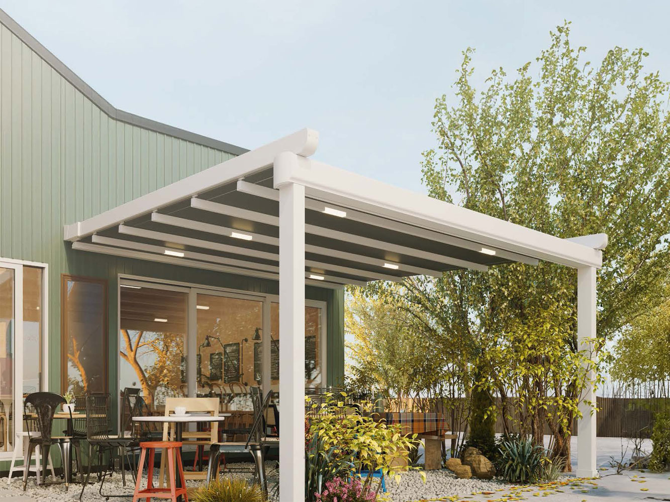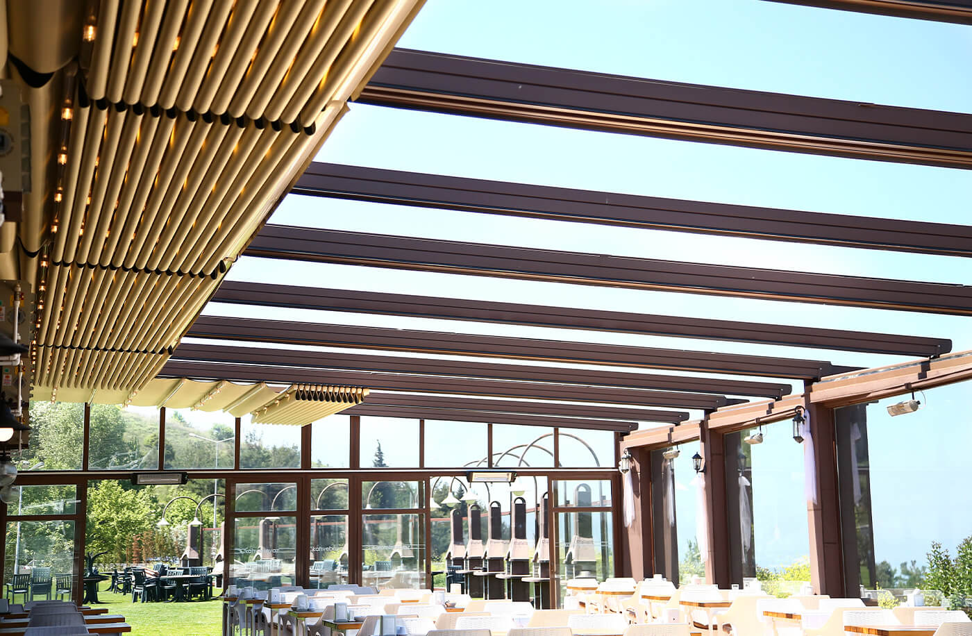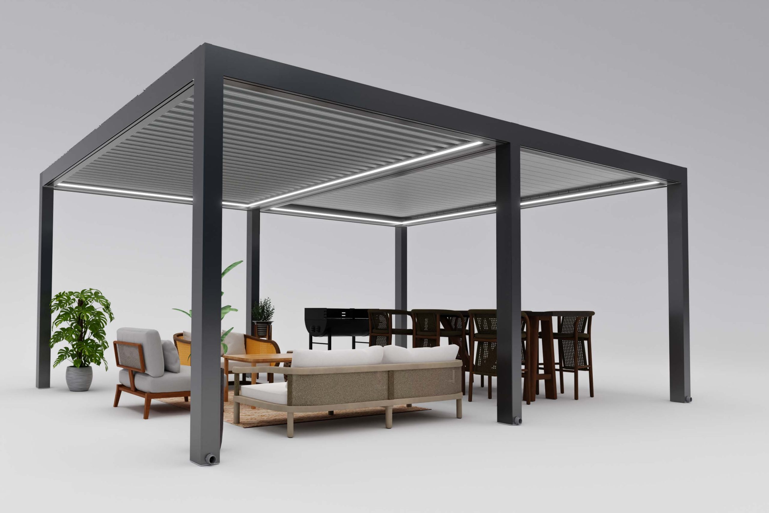 Ces toitures peuvent être équipées de systèmes LED blanc chaud, froid ou RGB, avec variateur d’intensité et contrôle à distance.